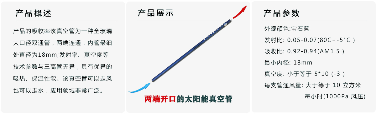 玻璃太陽(yáng)能雙通管是兩端開(kāi)口的太陽(yáng)能真空管。該產(chǎn)品的出現(xiàn)顛覆了很多領(lǐng)域太陽(yáng)能的應(yīng)用模式,通過(guò)該產(chǎn)品可很容